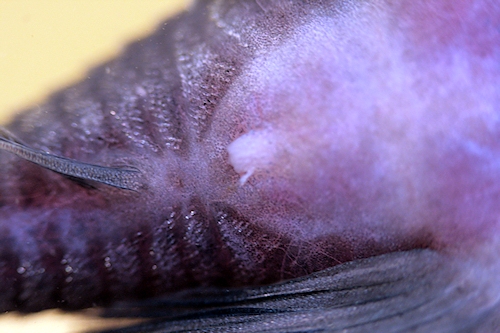Die Eier schüttelte ich aus der Höhle. Es waren 12 Stück, von denen aber einige schon anfingen zu verpilzen. Mit einem Skalpell entfernte ich rasch die abgestorbenen Eier. Nach ca. 7 Tagen kamen 2 Larven zum Schlupf, überlebten jedoch nicht den ersten Tag.
