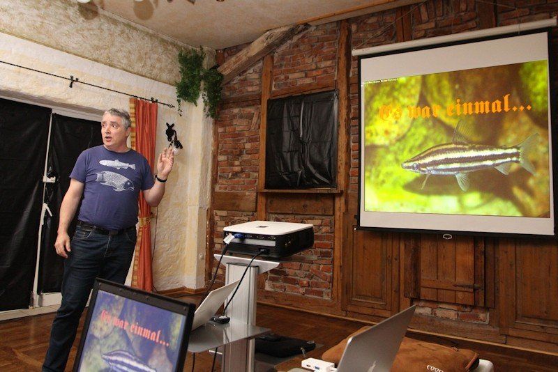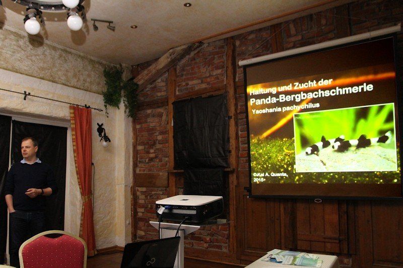 Kai A. Quante hatte sich am Zuchtprojekt der Panda-Bergbachschmerle (Yaoshania pachychilus) beteiligt. Kai berichtete uns in seinem Vortrag über seine Erfahrungen. Wie er nach der Vermehrung feststellte, wurden für das Zuchtprojekt Tiere verteilt, die erst ca. 2 Monate alt waren. Im Alter von ca. 1 Jahr haben sich diese Pandaschmerlen dann vermehrt. Bei den Nachzuchten zeigte sich, dass die Tiere die bekannte schöne Färbung etwa im Alter von 2 Monaten haben und sich dann immer mehr zu „grauen Mäusen“ entwickeln, die für den Handel nicht mehr relevant sind. Auch erklärt dieses, warum der Import dieser Tiere so schwierig und teuer ist. Nachdem sich die Schmerlenfreaks mit diesen Tieren eingedeckt haben, wird sie sicherlich auch aus dem Handel verschwinden.