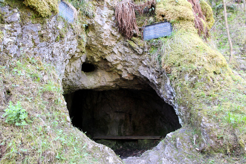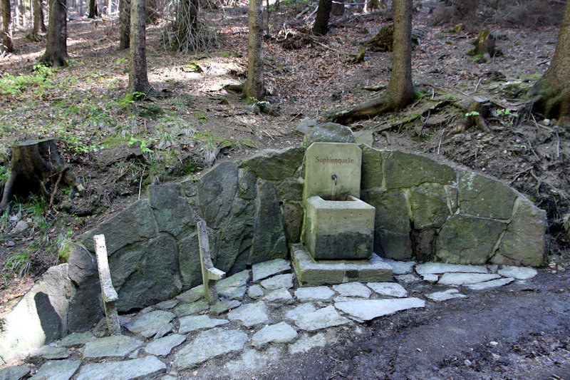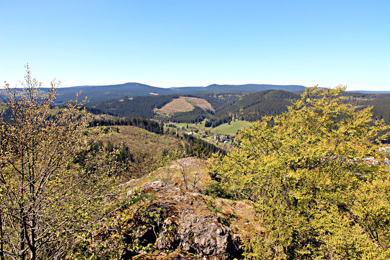 Neben der Sophienquelle und der Dachsquelle kommt man auf dieser Route auch am Großen Hermannstein vorbei. Von der Talseite her gibt es einen Zugang zu einer kleinen Höhle (falls man mal von Unwetter überrascht wird) und von der Bergseite führt eine Stahltreppe auf den Felsen, von dem man einen schönen Ausblich auf den Thüringer Wald, das Ilmtal und die Ortschaft Mannebach hat.
