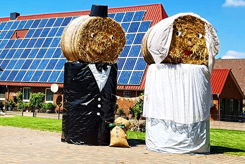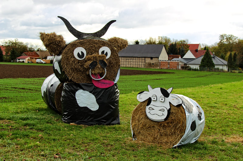 Meist in der zweiten Hälfte des Jahres, zu verschiedenen Festen, wie zum Beispiel zu Kirmes, Erntedankfest, Jubiläen der Freiwilligen Feuerwehren, Hochzeiten, … ist es mancherorts auf dem Land üblich, Strohballen aufzuschichten und als Figuren (Bauern, Müller, Ehepaare, Fußballspieler, Windmühlen, Kühe, Ochsen, Stare, Traktoren, Spaceshuttle, Trucks, Piratenschiff, Windmühlen, Bauwerke, Biergläser, …) zu dekorieren. So manches Kunstwerk ist da schon entstanden. Viele der Ideen und auch die Umsetzung aus Strohballen hat mich begeistert. Meine Anerkennung den Machern dieser Kirmes-Figuren!