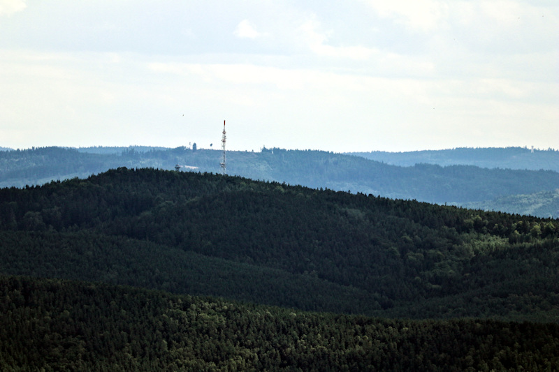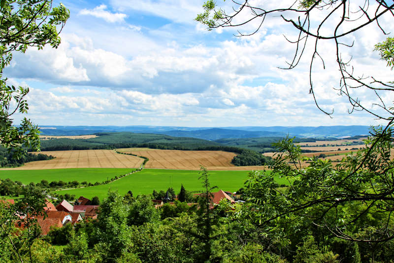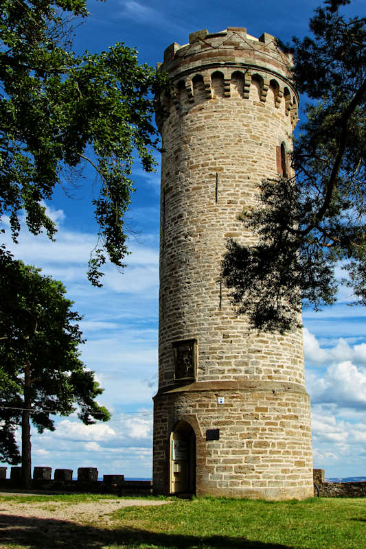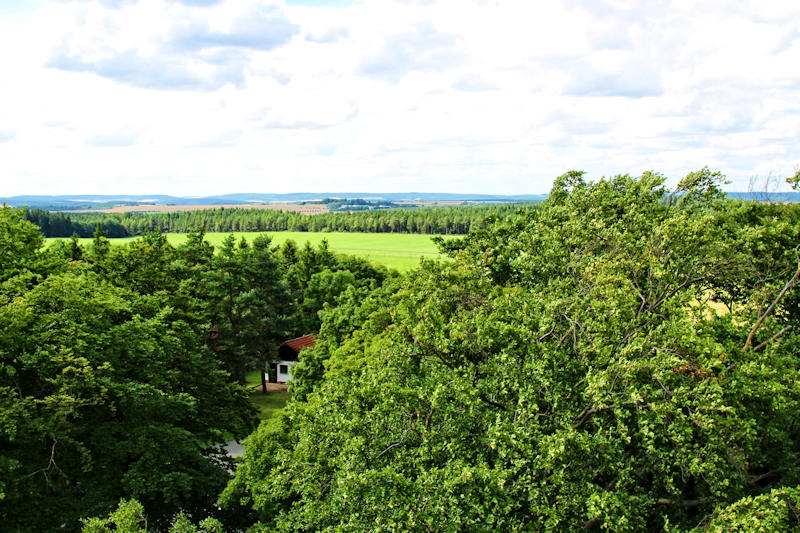 Von dem Turm hat man eine sehr schöne Aussicht über die Saale-Ilm-Platte bis hin zu den Höhenzügen des Thüringer Schiefergebirges. Mit etwas Glück soll man bei sehr klarer Sicht auch den Brocken im Harz sehen können.