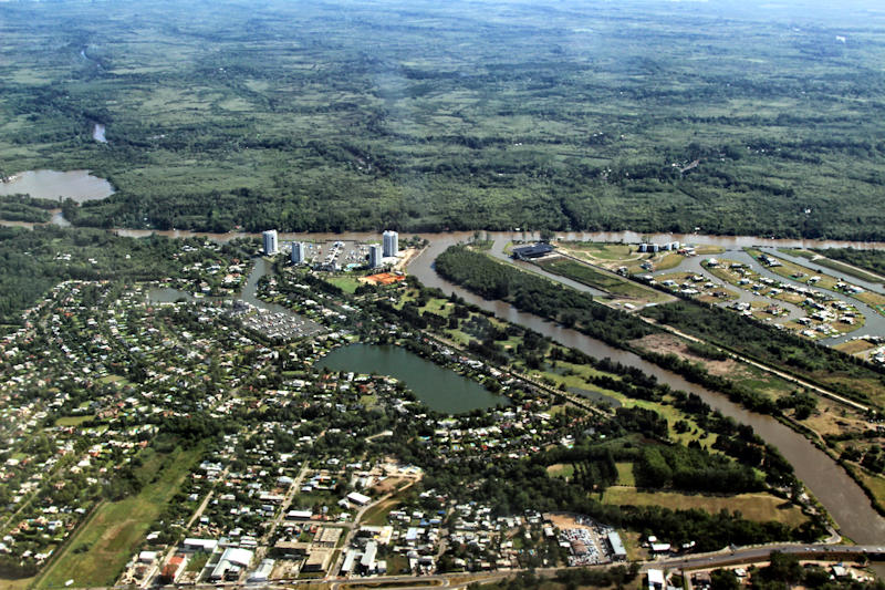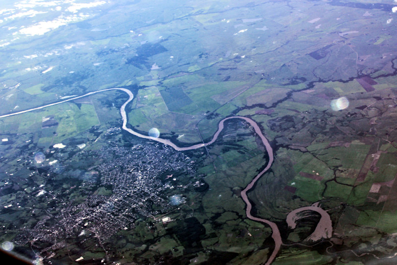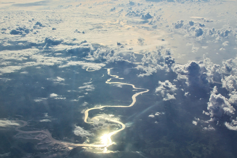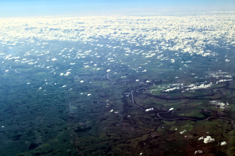 Wenn man schon einen Fensterplatz hat, so möchte man eigentlich auch ein paar Blicke nach draußen werfen können. Aber außer Wolken war bald nichts mehr zu sehen. Erst eine Stunde später gab es auch ein paar Wolkenlücken. So war es möglich den Rio Jacuí bei Cochoeira do Sul zu sehen.