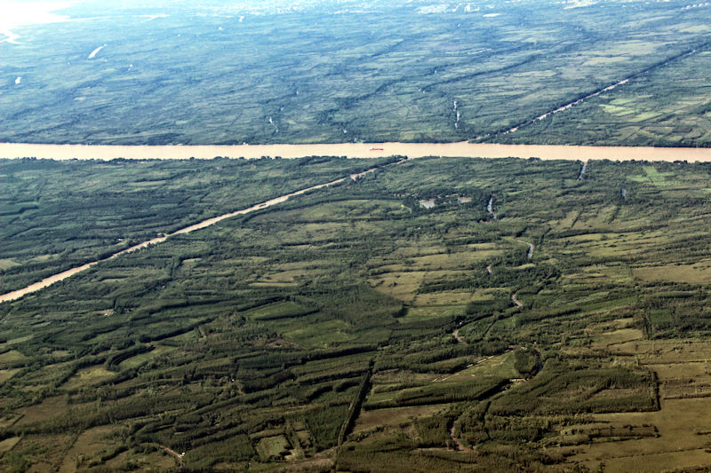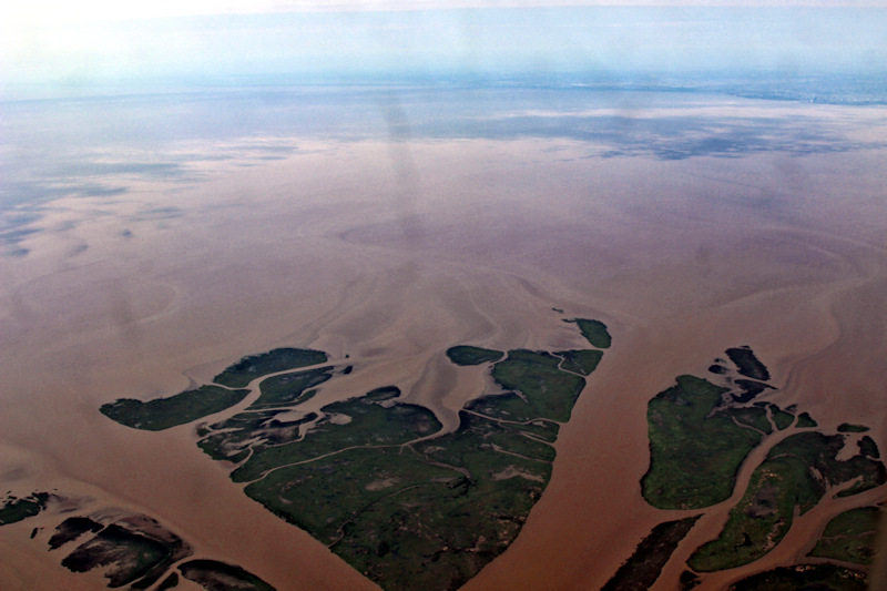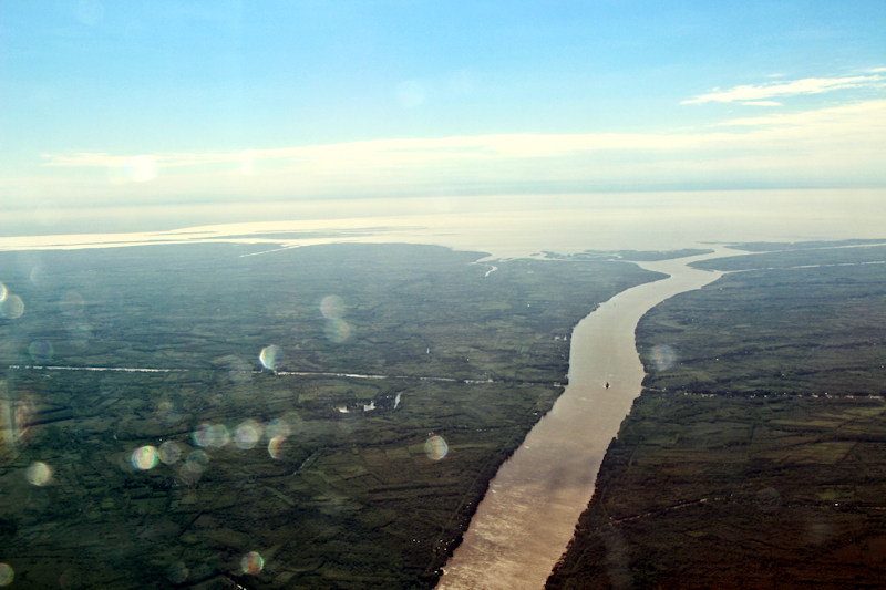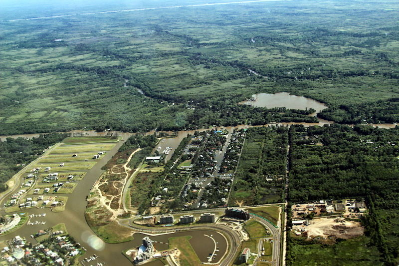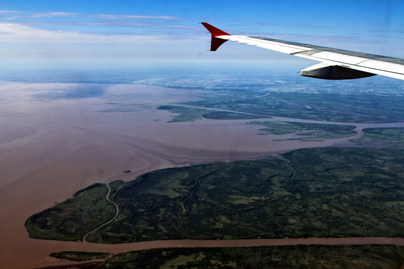 Über Uruguay war dann wieder alles weiß. Erst nahe des Río de la Plata bekamen wir relativ gute Sicht. Im Gegensatz zu 2016 flog unser Flugzeug dieses Mal den Aeroparque von Norden her an. War es 2016 fast ein Rundflug über Buenos Aires so war es nun ein kleiner Rundflug über die Isla Solis weiter über das westliche Delta des Río Paraná. Das Delta zeigte sich als riesige grüne Fläche, die durch diverse Flussläufe durchzogen wird. Kurz vor der Landung überquerten wir Tigre. Das bekannte Ausflugsziel, wo ich 2014 / wir 2016 unterwegs waren, lag uns zu Füßen. Beeindruckend waren auch die vielen kleinen Jachthäfen.