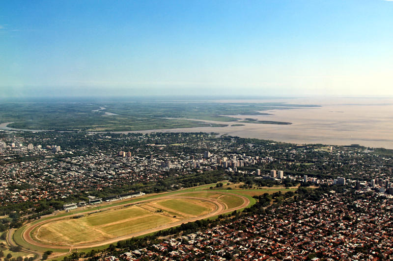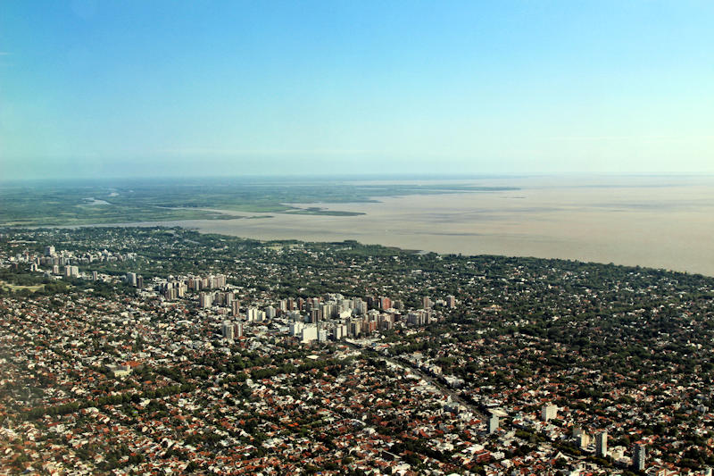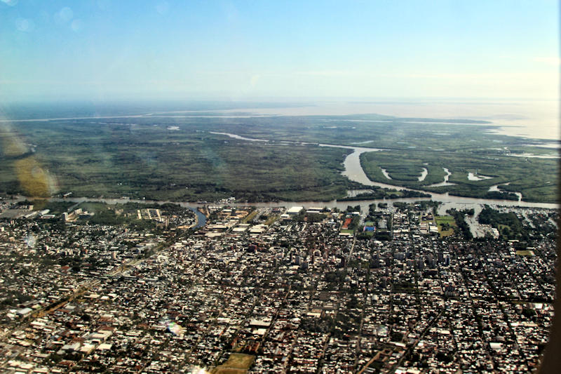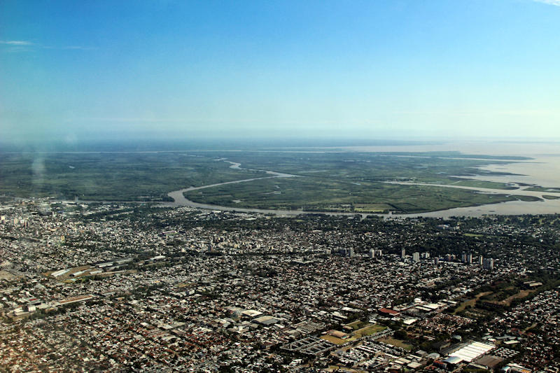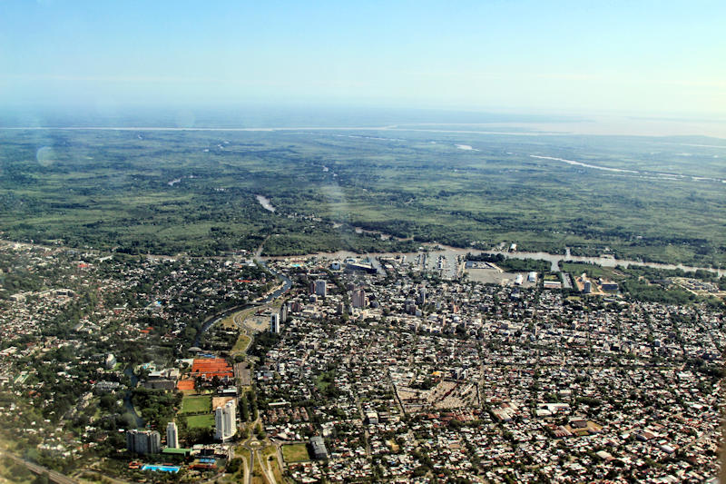 Über Uruguay war dann wieder alles weiß. Erst nahe des Río de la Plata bekamen wir relativ gute Sicht. Im Gegensatz zu 2016 flog unser Flugzeug dieses Mal den Aeroparque von Norden her an. War es 2016 fast ein Rundflug über Buenos Aires so war es nun ein kleiner Rundflug über die Isla Solis weiter über das westliche Delta des Río Paraná. Das Delta zeigte sich als riesige grüne Fläche, die durch diverse Flussläufe durchzogen wird. Kurz vor der Landung überquerten wir Tigre. Das bekannte Ausflugsziel, wo ich 2014 / wir 2016 unterwegs waren, lag uns zu Füßen. Beeindruckend waren auch die vielen kleinen Jachthäfen.